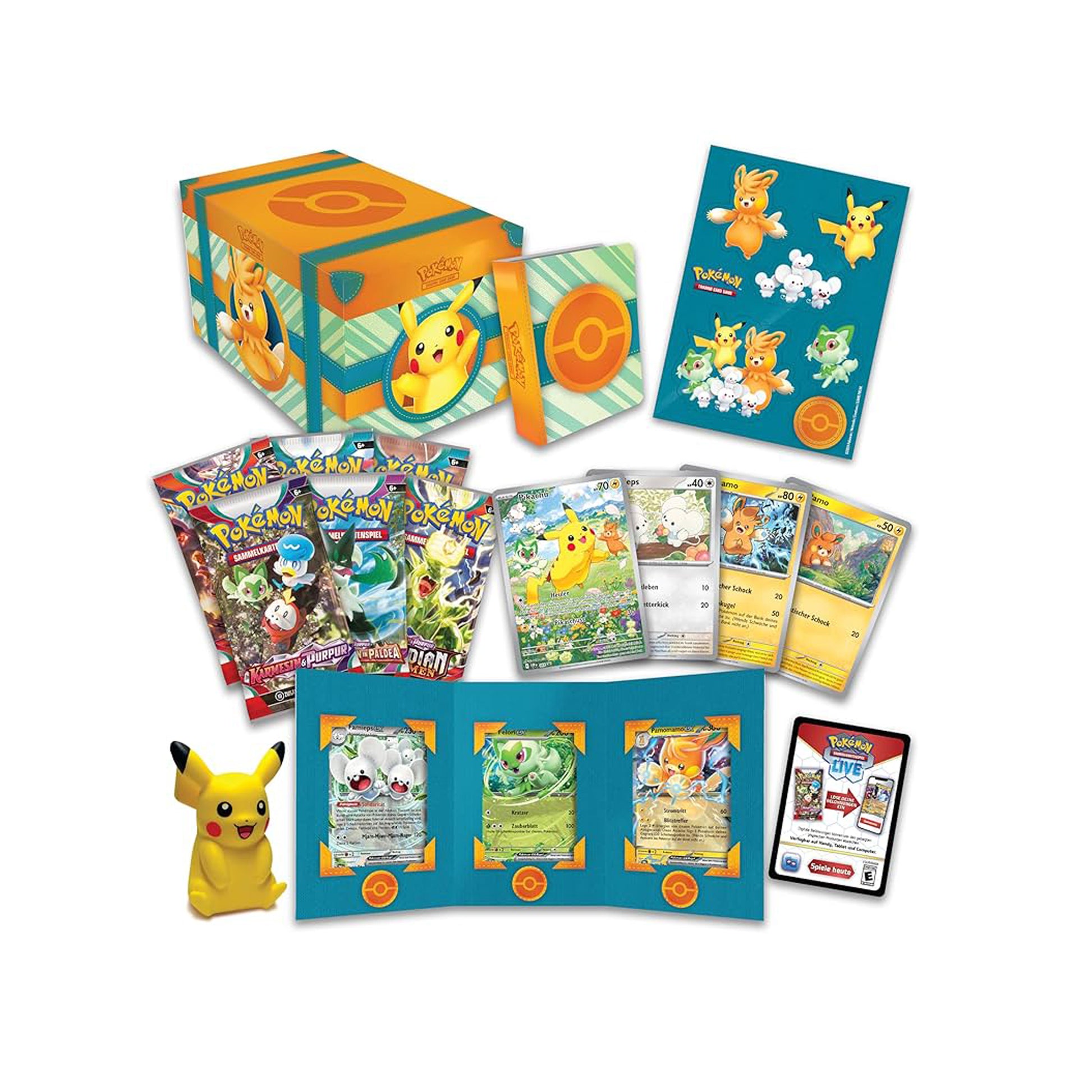 In deinem Set findest du 7 exklusive Holo-Promokarten mit beliebten Pokémon aus der Paldea-Region: Pikachu, Felori-ex, Pamo, Pamamo, Pamomamo-ex, Zwieps und Famieps-ex – spielbereit und direkt fürs Deck oder die Vitrine geeignet.
